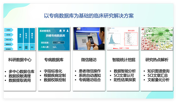 我们希望通过这套解决方案,为医院的科研信息化建设提供助力。通过对医院内部现有病历数据结构化、标准化整合治理,构建专病数据库,依托自动化统计探索工具,挖掘医院大数据,构建从研究设计到科研产出的完整闭环。
