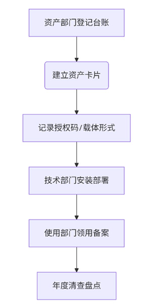 资产管理部门:拥有软件资产卡片的创建、修改、状态更新、发起处置的权限。负责维护台账,审核处置申请。
