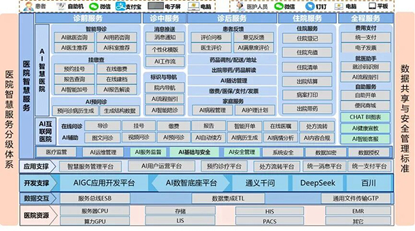 (5)医院资源:基础设施与安全主要由服务器、算力GPU、存储、HIS、EMR、PACS等提供,保障基于自然语言驱动的医院智慧服务基础底层架构。