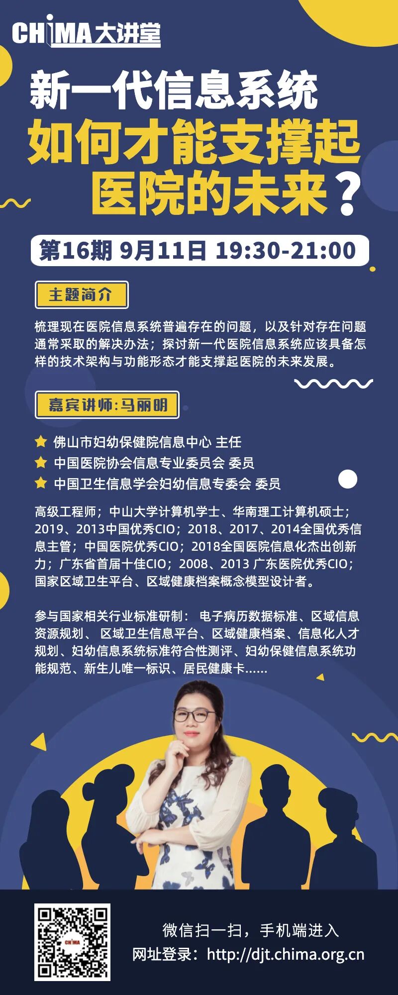 医院信息系统的创新是一个永恒的话题。9月11日19:30开讲的CHIMA大讲堂第十六期,邀请佛山市妇幼保健院信息中心主任马丽明做客,将就“新一代信息系统如何才能支撑起医院的未来?”这一热门话题与大家进行沟通。