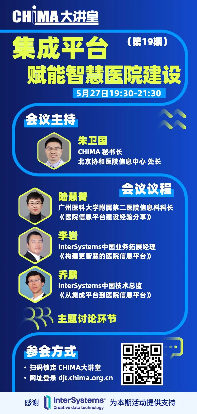 在新一轮医疗改革的推动下,智慧医院获得长足发展。智慧医院是对医院信息化、互联网化的融合和进阶,代表了未来医院的发展方向。医院在进行集成平台规划时,需与智慧医院建设整体战略规划达成一致。医院要建成适合自身情况的并能够全面支撑智慧医院建设的集成平台,从而提升医院诊疗和管理水平。CHIMA大讲堂第十九期邀请医院信息化专家和企业技术专家,共同探讨集成平台赋能智慧医院建设这一话题。敬请收看。