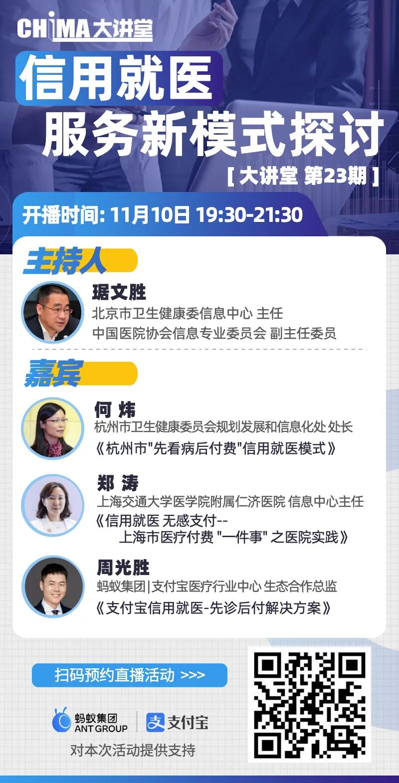 11月10日19:30,CHIMA大讲堂第23期聚焦“信用就医服务新模式”这一话题,邀请北京市卫生健康委信息中心主任、中国医院协会信息专业委员会副主任委员琚文胜担任主持人,杭州市卫生健康委员会规划发展和信息化处处长何炜、上海交通大学医学院附属仁济医院信息中心主任郑涛、蚂蚁集团支付宝医疗行业中心生态合作总监周光胜将进行主题报告演讲,分别从政府、医院和企业角度分析探讨信用就医在医院的应用。