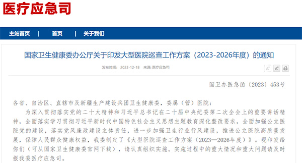 国家卫生健康委印发《大型医院巡查工作方案(2023—2026年度)》