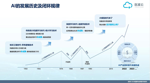 过去一年,AI的关注热度再次攀升。回顾AI技术的演进历程,从最初的符号逻辑专家系统辅助决策,到统计机器学习的疾病预测,再到以医学影像处理为代表的深度学习,直到今天的多任务引擎大模型,每一步都离不开坚实的知识与数据基础以及算法能力的不断演进。