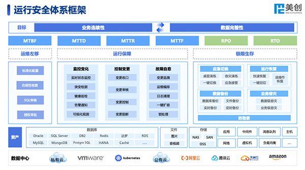 2.运行安全:美创科技聚焦业务连续性和数据完整性,通过运维左移、监控状态变化、控制运维变更、快速重建数据和灾备接管,保障业务运行处于可预期范畴,并提供底线防御和极限生存能力,实现业务运行韧性。基于新一代灾备一体化平台(DRCC)面向应用、数据库、主机、存储、文件等不同资产类型提供高效的同步复制能力,保证数据完整性,同时针对散杂多乱的云资产和灾备能力进行集中管控,通过预案评估、桌面演练、容灾演练、灾难切换等功能,实现灾备切换流程标准化、自动化和可视化,保障业务连续性。