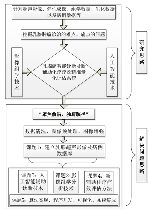 本项目分为5个课题,如图1所示。数据清洗、图像预处理以及图像增强是开展研究的首要步骤,规整的数据是后续研究的基础;影像病灶的精准标注是深度学习、组学分析关键环节;本项目拟研究的人工智能辅助诊断技术、影像组学分析技术以及新辅助化疗疗效评估方法等核心技术,是实现系统功能的关键途径;程序开发、可视化以及系统集成,是将技术转化为落地产品的重要手段。