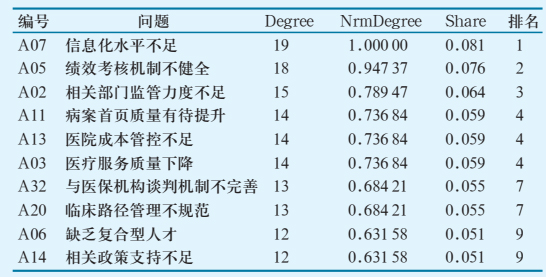 表3 我国DRG支付方式改革问题点度中心度测量结果(前10位)