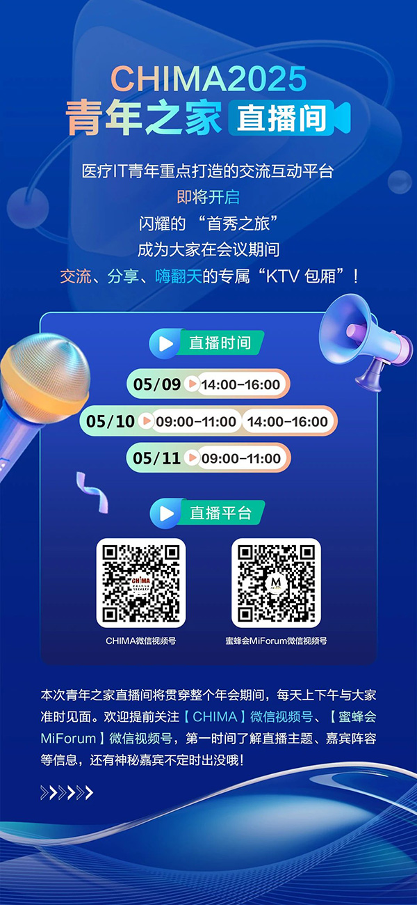 宝子们,2025年中国医院信息网络大会(CHIMA 2025)即将开幕,青年之家直播间全新升级,作为给医疗IT青年重点打造的交流互动平台,也将开启闪耀的 “首秀之旅”,成为大家在会议期间交流、分享、嗨翻天的专属“KTV 包厢”!现在,让我们一起了解一下吧~