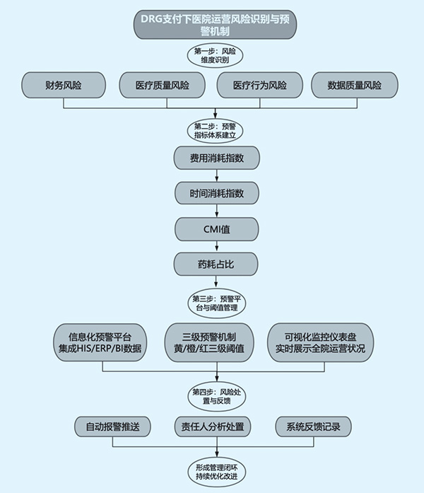 构建科学的预警指标体系后,须通过信息化平台将其转化为高效的管理工具,并辅以动态的阈值管理,从而实现风险的早期识别、精准评估与自动干预。首先,依托现有的医院信息系统(HIS)和决策支持系统(DSS),构建集成的DRG运营风险动态监控平台。该平台应具备数据自动采集、实时计算、可视化呈现及智能报警功能,需按4个风险维度分区布局,以图表、趋势线、红绿灯等形式,直观展示各项关键指标的实时状态与历史变化,使管理者能够一键获取全院、科室乃至主诊组层面的运营状态。其次,阈值管理是触发预警的核心机制。需依据历史基线、行业标杆、政策要求及医院战略目标,为每项预警指标科学设定不同风险等级的临界值。黄色预警(提示级):指标偏离正常范围但仍处于可控区间,提示管理层需关注趋势变化。如CMI值连续两周小幅下降。橙色预警(警告级):指标已明显异常,可能对运营或质量造成实质性损害,需责任部门介入分析并制定应对措施。如药耗占比大幅超出目标值。红色预警(危险级):指标严重偏离,表明运营、质量或行为方面可能存在重大风险或违规,需立即启动应急响应。如低风险组死亡率骤升或疑似高编码病例比例异常偏高。