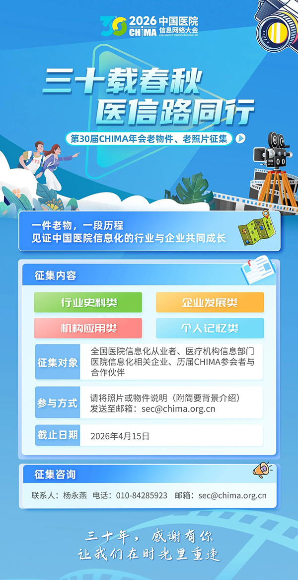 值此第30届CHIMA年会召开之际,我们面向全体行业同仁、医疗机构、医院信息化企业,征集见证行业发展的老物件、老照片等老资料。