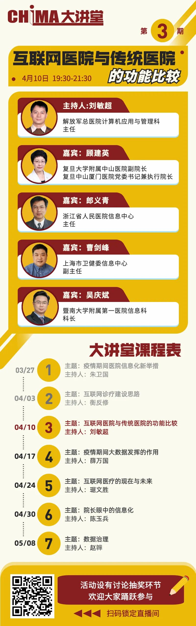 疫情使互联网医疗再度成为热点。与传统医院相比,互联网医院有哪些新功能?4月10日晚19:30分举办的CHIMA大讲堂第三期,将邀请业内专家探讨互联网医院与传统医院的功能比较,敬请收看。